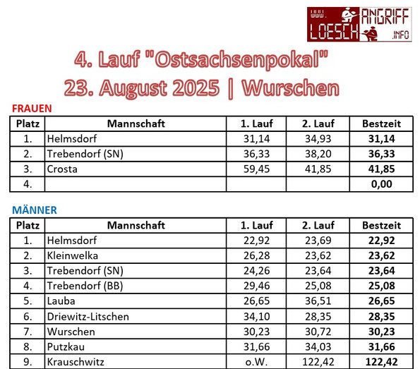 Als die Einzeldisziplin beendet war ging man Nahtlos zum Löschangriff im Ostsachsenpokal über. Nach jeweils zwei Läufen stand am Ende der Dritte Platz für unsere Jungzz fest. Und bei den Frauen konnte ebenfalls ein Dritter Platz gefeiert werden. Der erste Platz bei den Männern ging an Freiwillige Feuerwehr Crosta und Platz zwei an Feuerwehr Helmsdorf . Bei den Frauen hieß der Sieger Helmsdorf und Platz zwei ging hier an Crosta.